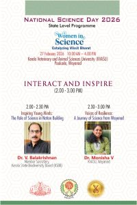 The Kerala State Council for Science, Technology and Environment (KSCSTE), in collaboration with Kerala Veterinary and Animal Sciences University (KVASU), is organizing the National Science Day 2026 – State Level Programme at KVASU, Pookode, Wayanad.